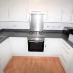 A range of matching high gloss wall and base units with complimentary work surface with splash back. Integrated oven with four ring gas hob with hood over. Sink and a half with mixer tap. A fridge freezer and a washing machine. Vinyl flooring.