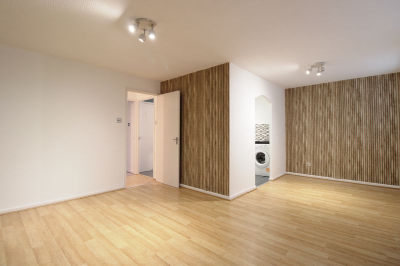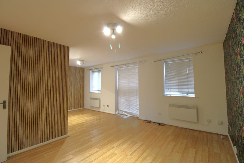 Windows to the front elevation, laminate flooring, tv point, light point, room for a dining table and storage space.