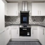 Rolled top work surfaces, sink inset with mixer tap over, room for a fridge freezer, plumbed in for a washing machine, range of eye level and base level matching units, electric oven and hob with extractor hood over.