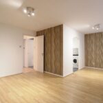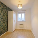 Laminate flooring, storage, wall mounted storage heater and light point.