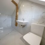 Stairs to wetroom, stunning white granite flooring, elegant glass staircase a striking blend of architectural innovation and refined design. Crafted from high-strength tempered glass, this staircase offers a seamless, floating appearance that enhances natural light and creates an open, airy ambiance.