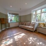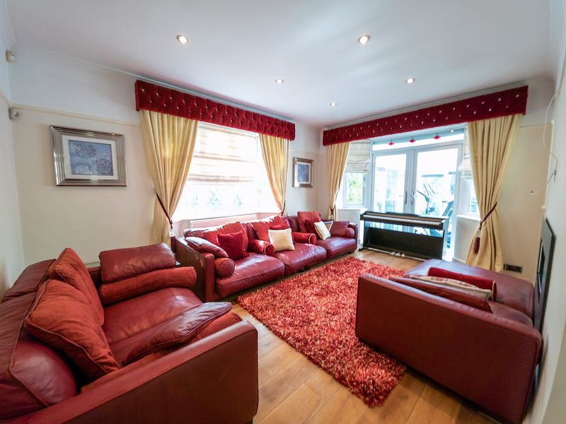 Featuring double glazed windows to both the front and side elevations, this bright and airy space is enhanced by ceiling-mounted spotlights and elegant solid wood flooring, offering a warm and inviting atmosphere.