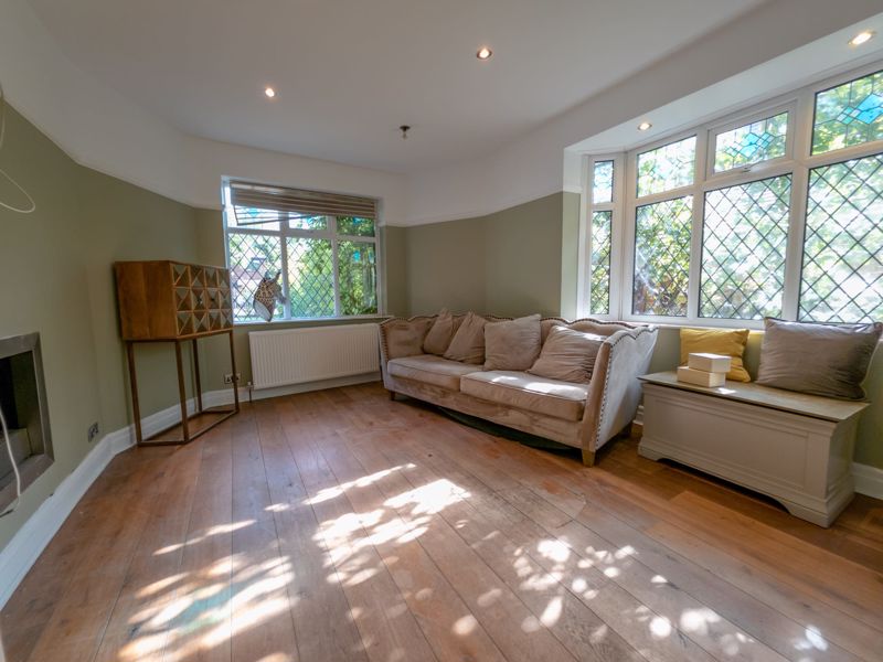 Solid wood flooring throughout, adding warmth and character. A striking feature fireplace serves as the focal point of the room, complemented by a radiator for comfort. Natural light floods the room through a charming leaded window to the front elevation and a double-glazed bay window to the side, creating a bright and airy ambiance. The room is finished with ceiling-mounted spotlights, offering a modern touch and practical lighting.
